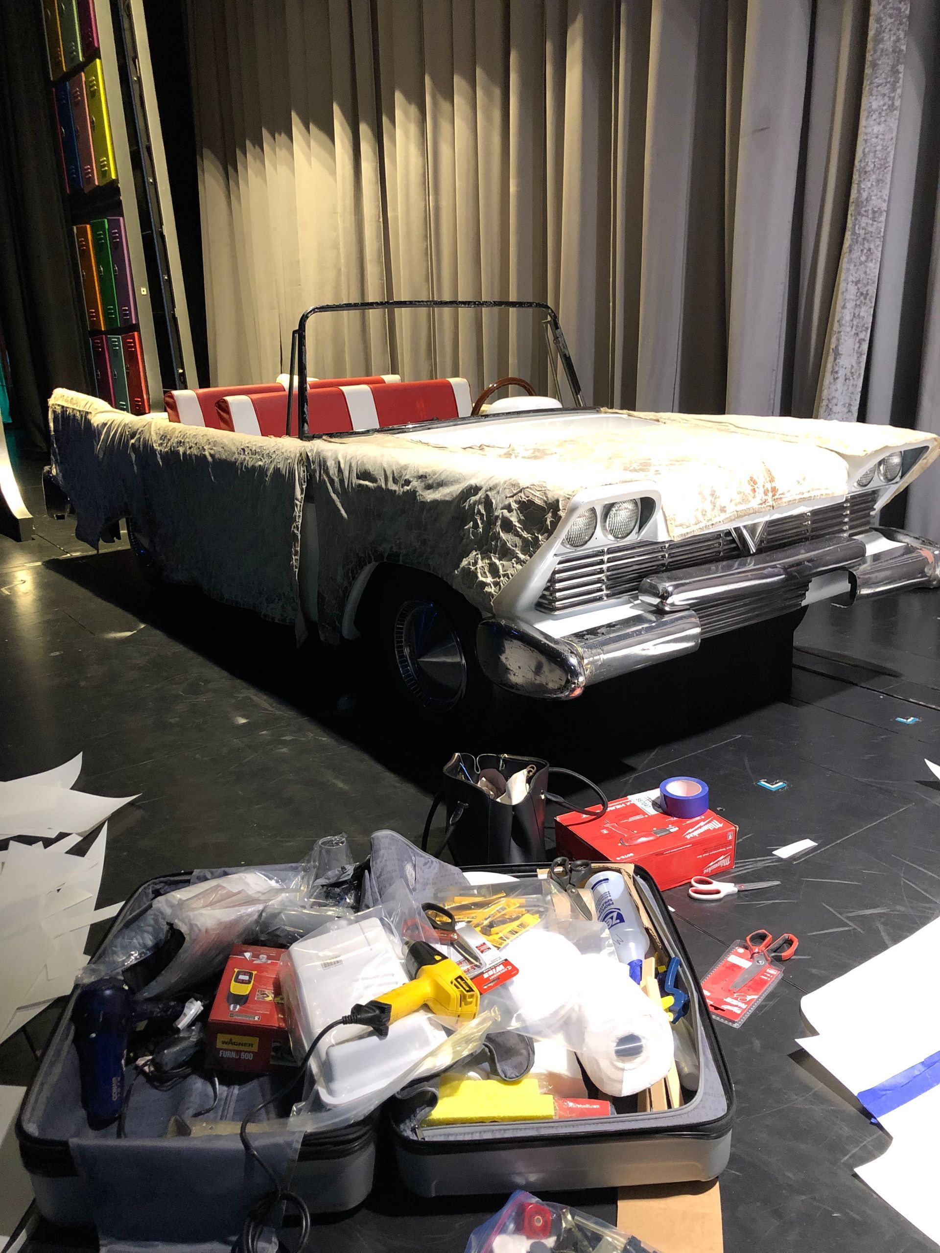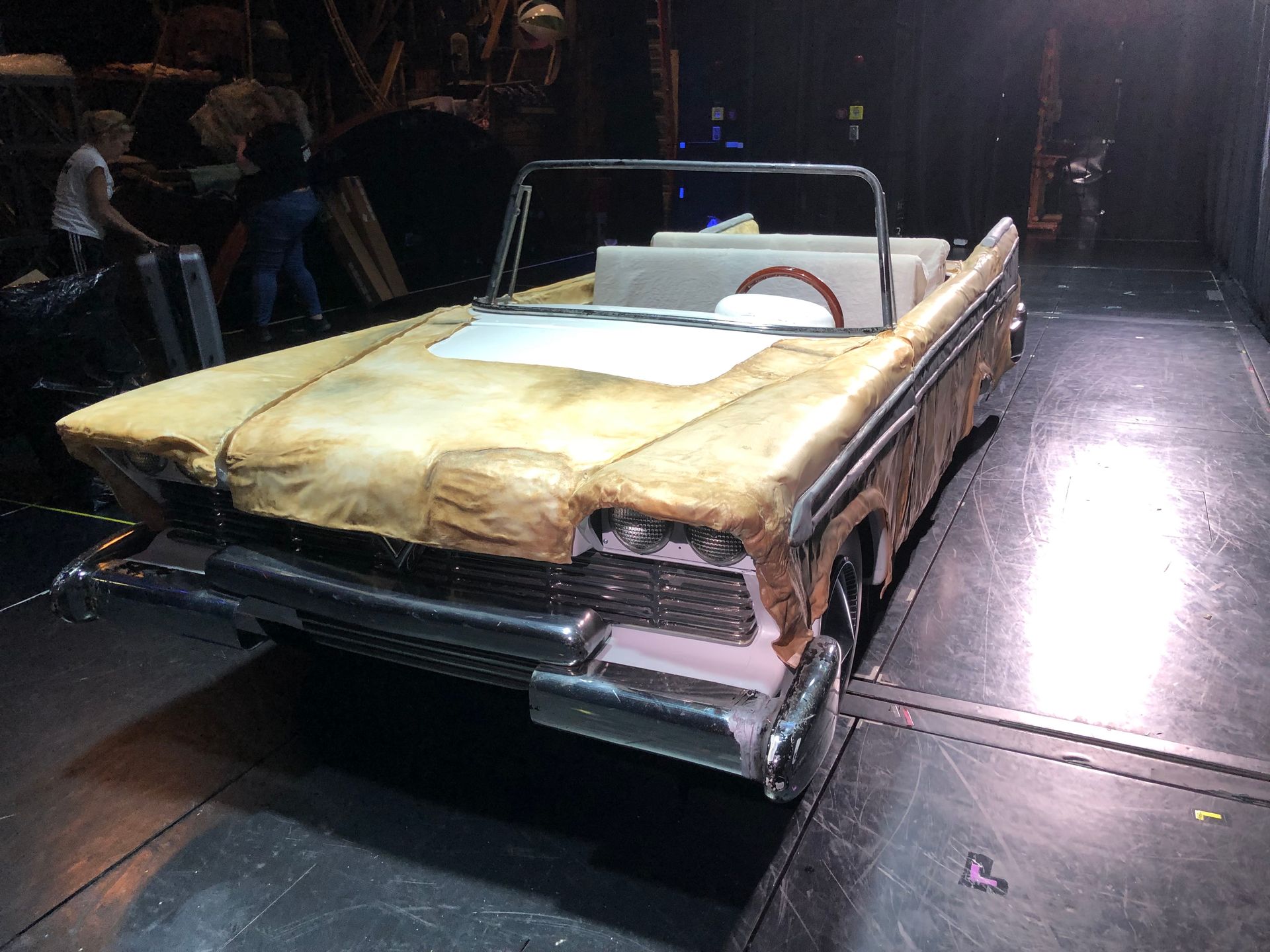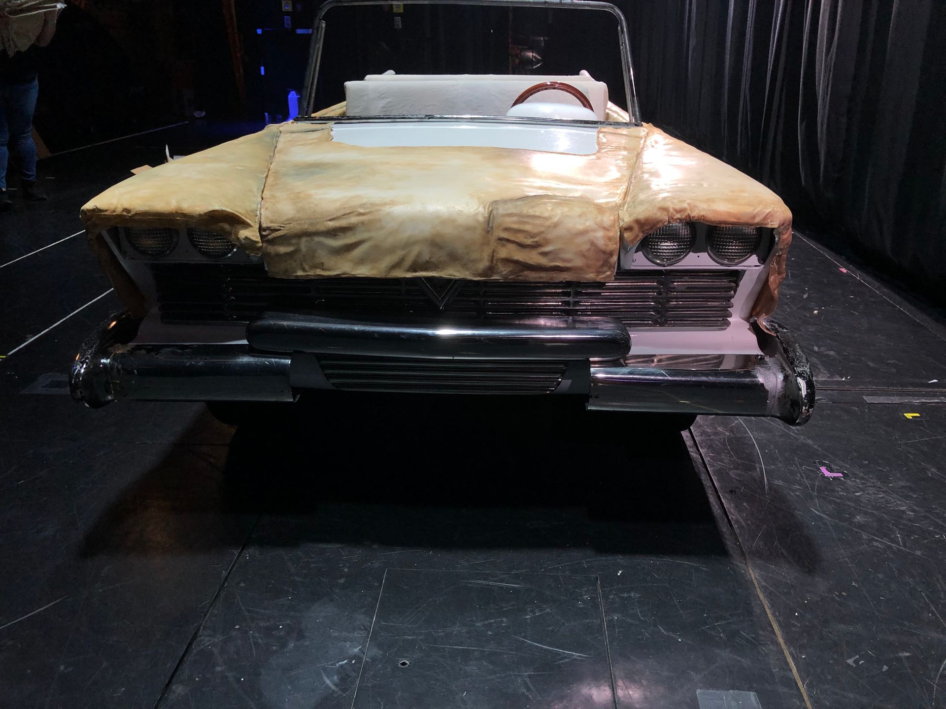 Royal Caribbean's Harmony of the Seas has daily performances of the broadway show "Grease", which includes the famous "Greased Lightning" transformation; going from a dirty beat up car to a beautiful new one. The car cover, was in need of repair, so Bombshell stepped in.