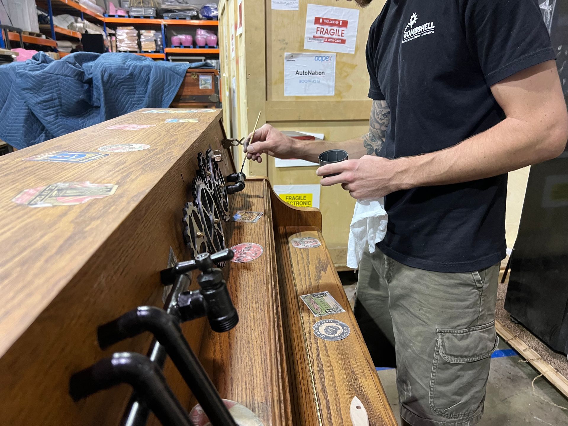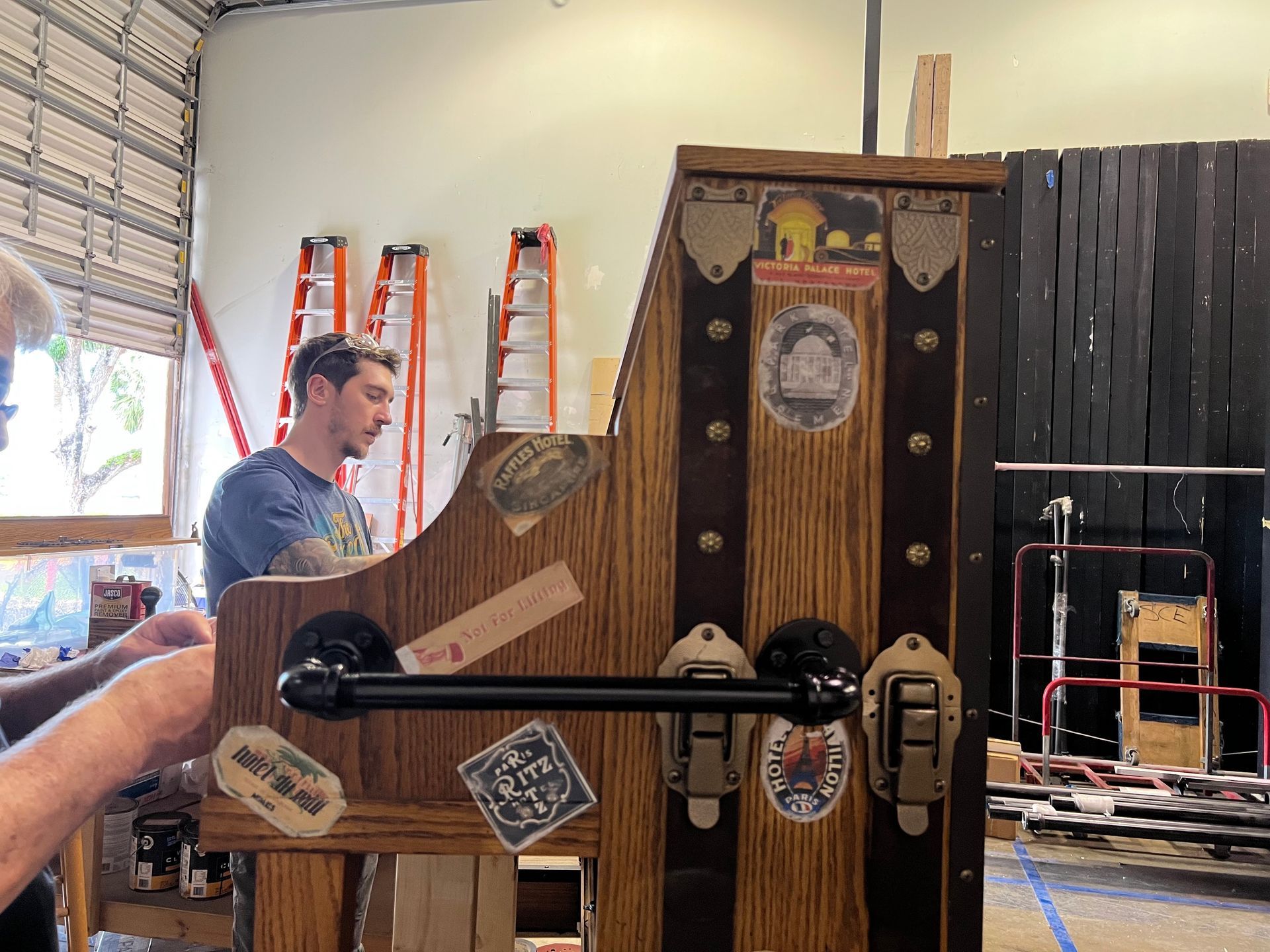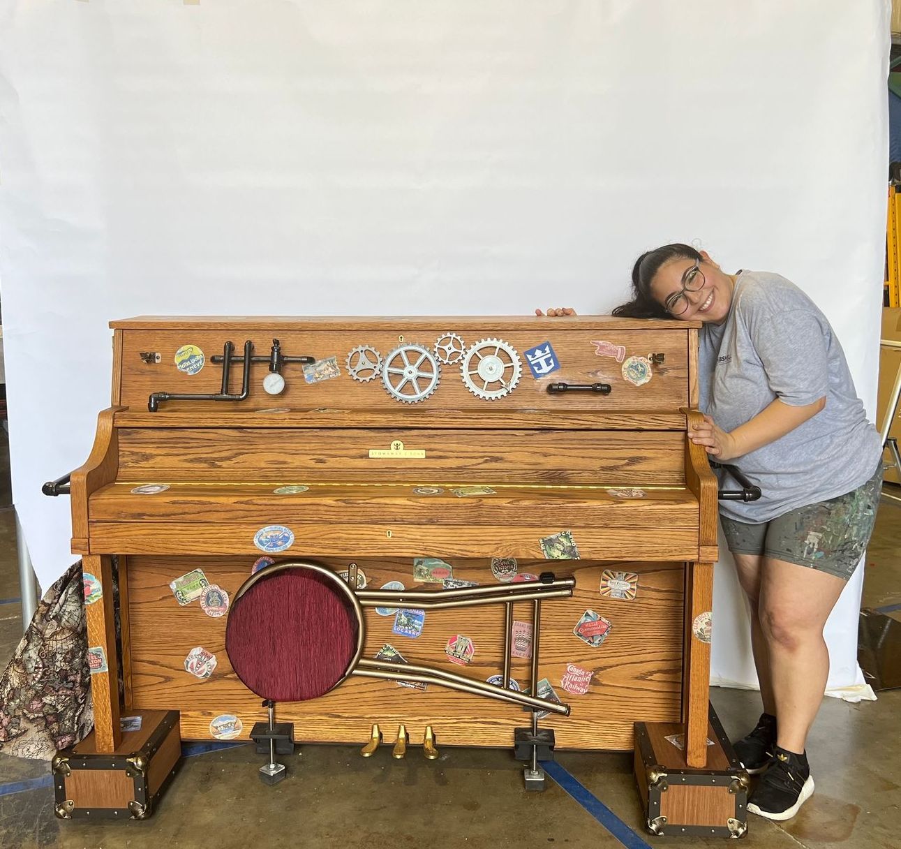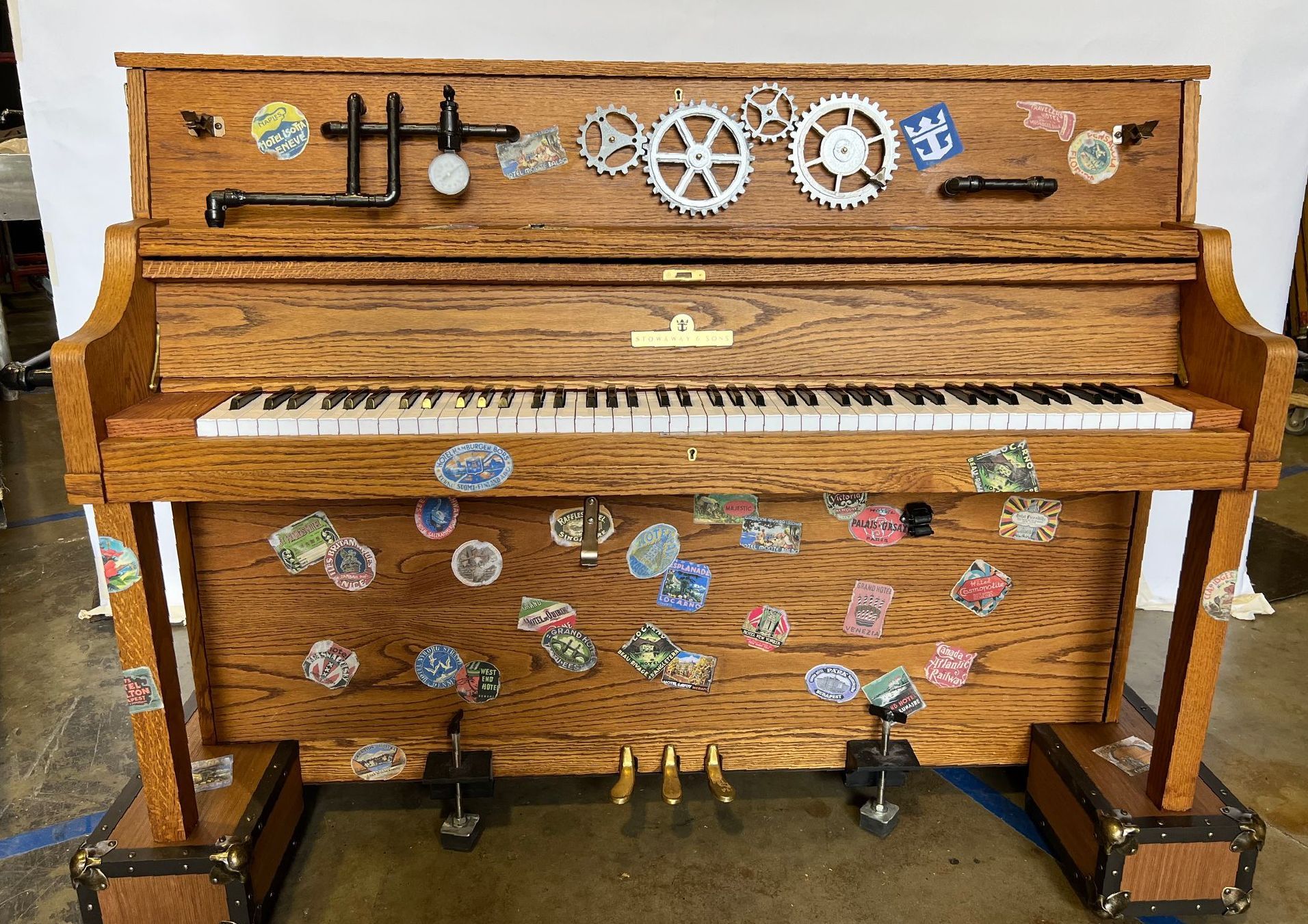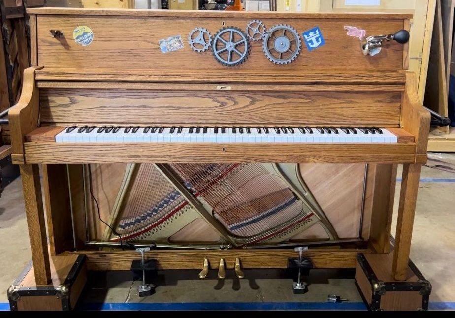The "Stowaway Piano" is an on-board piano with a pianist who randomly materializes anywhere on the ship to entertain guests. Bombshell designs and retrofits standard pianos, while maintaining their ability to function as musical instruments.